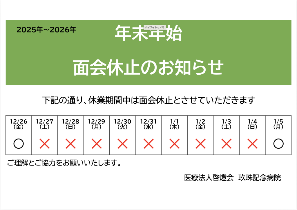 今年の年末年始の休診において、面会が禁止となりますので、お知らせいたします。
